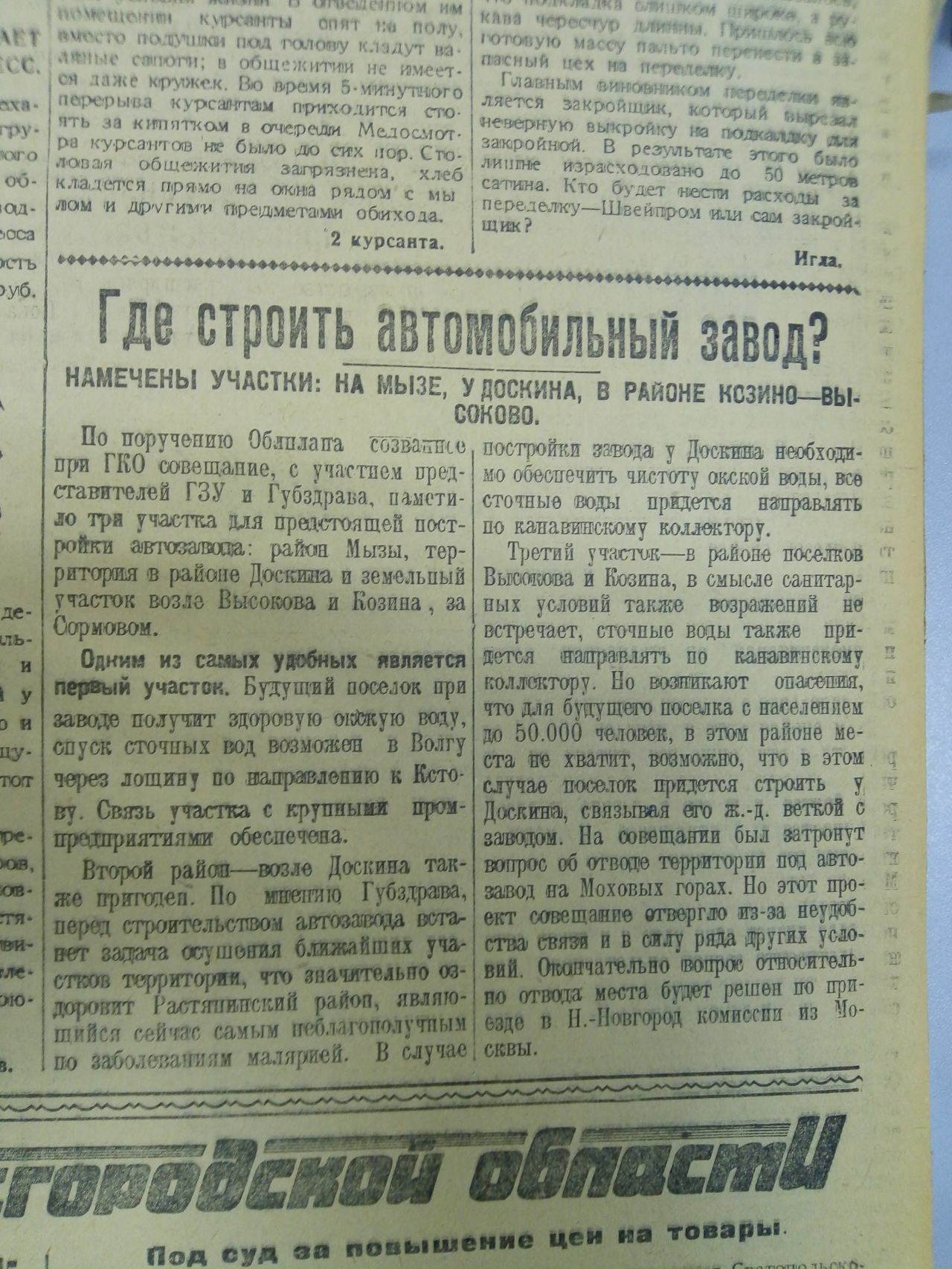 «По поручению Облплана созванное при ГКО совещание с участием представителей ГБУ и Губздрава наметило три участка для предстоящей постройки автозавода: район Мызы, территория в районе Доскина и земельный участок возле Высокова и Козина, за Сормовом.