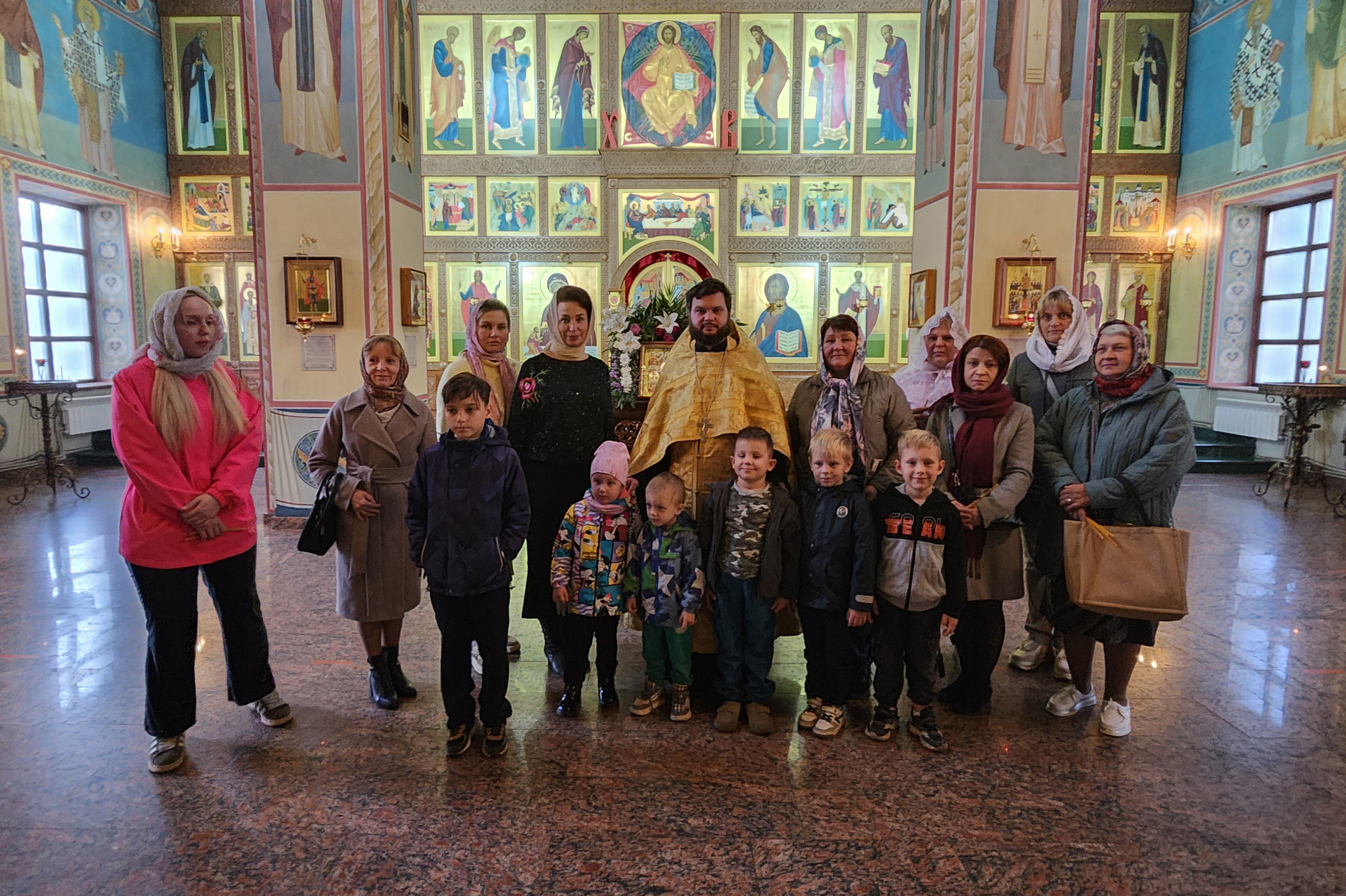 Затем священнослужитель провёл для гостей экскурсию по храму. Слушая рассказ священника, дети рассматривали архитектуру и внутреннее убранство храма, иконостас и святые иконы на стенах.