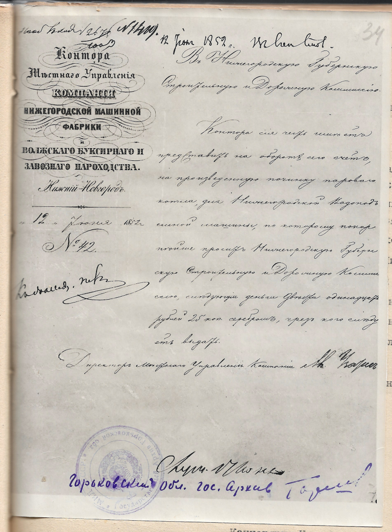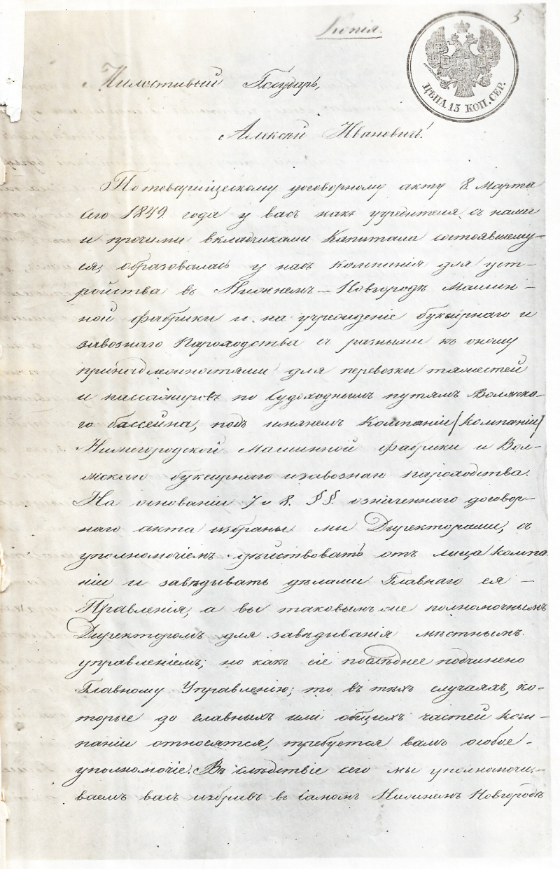Не поименованные в заметке предприниматели — это учредители компании Нижегородской машинной фабрики и Волжского буксирного и завозного пароходства, которая возникла в Петербурге 8 марта 1849 года. А именно: тайный советник князь Лев Викторович Кочубей, полковник князь Владимир Александрович Меньшиков, отставной гвардии поручик Дмитрий Егорович Бенардаки. Компаньоны решили построить в окрестностях Нижнего Новгорода судостроительное предприятие.