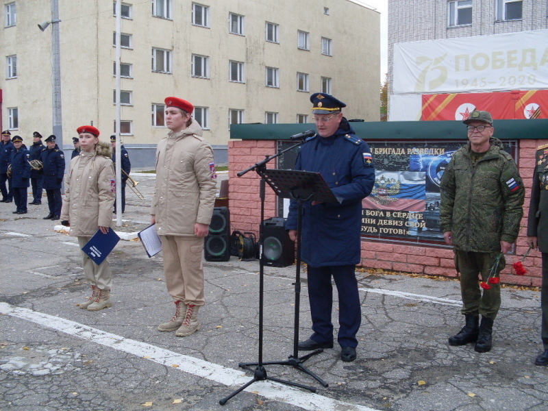 По команде начальника местного штаба ЮНАРМИИ Сормовского района Ильи Рогачева командиры юнармейских отрядов доложили о готовности принятия Присяги ЮНАРМЕЙЦЕВ и приняли Присягу. Светлана Горбунова, Алесей Роговицин, Илья Рогачев, Алексей Трофимов, Валерий Гогуленко вручили новоиспечённым юнармейцам удостоверения и знаки ЮНАРМИИ. После этой процедуры последовала минута молчания в честь погибших Героев России, а затем возложение цветов к памятнику погибших, в различных военных операциях, военнослужащих воинской части.