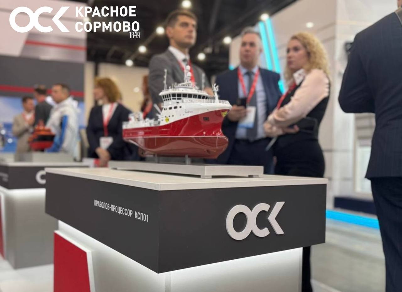 На выставке представлена, в частности, модель КСП01 — серия из пяти краболовов-процессоров, которую строит завод ОСК «Красное Сормово» для компаний «Северо-Западного рыбопромышленного консорциума».