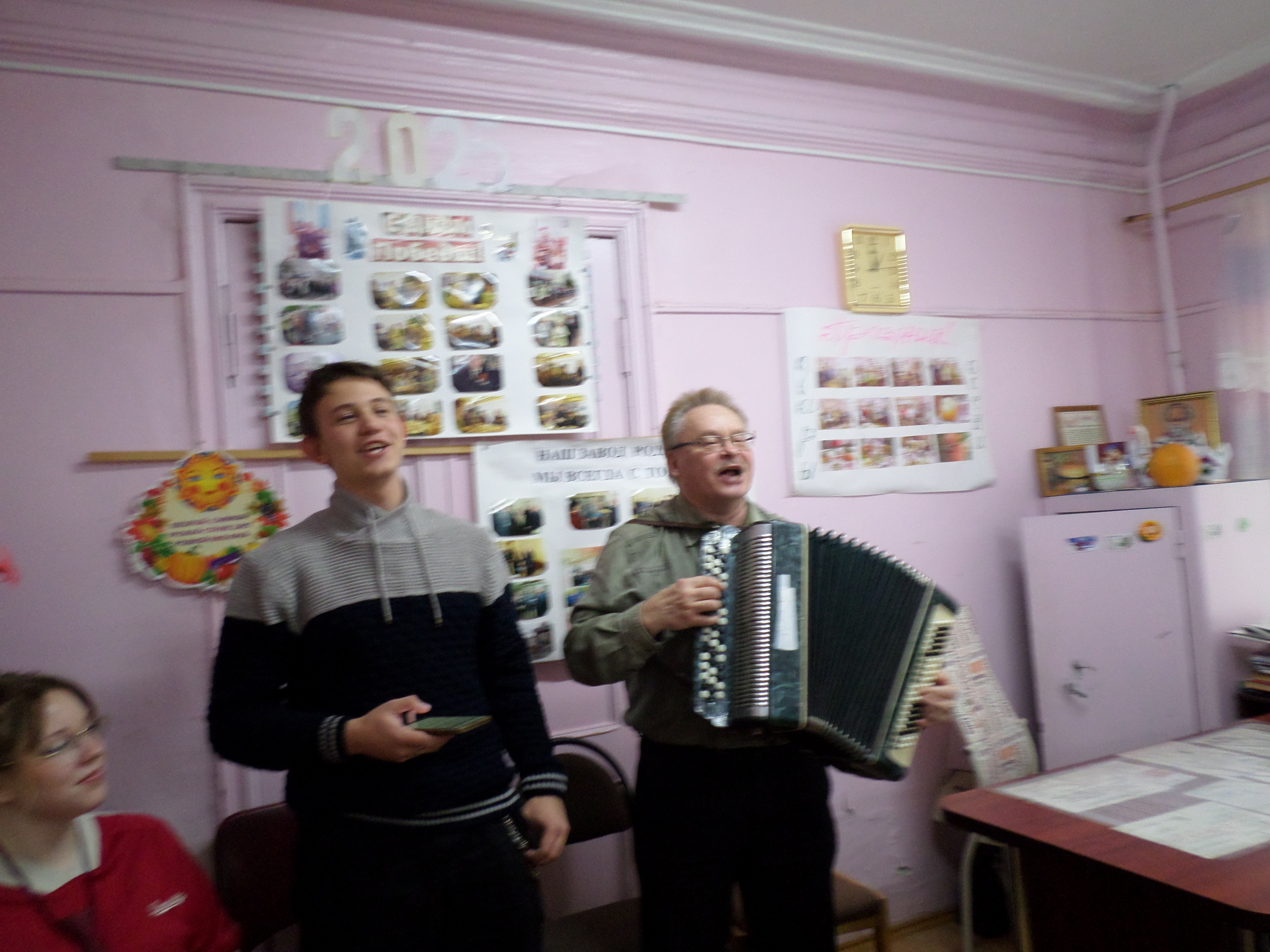 Девятого октября с Днём пожилого человека ветеранов поздравили Сергей Борисович Караштин (баян), первокурсники Артём Корнев (гитара) и Мария Кулешова. Маша спела всеми любимые частушки и вместе с заводчанами подтягивала популярным песням разных времён. Гитарист Артём порадовал зрителей песенкой про сварщика, особенно всем понравился припев «сварщик, сварщик парень работящий…», который подпевали всем залом. «Теперь тебе прямая дорога к нам на завод», - сказали ветераны будущему сварщику.